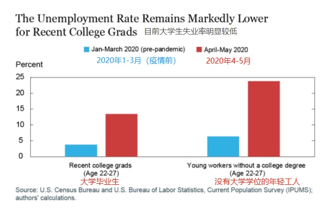 而在疫情环境下,由于工资普遍下降,上大学的机会成本下降,回报率更是上升至17%。此外,延迟上大学也会侵蚀大学学位的价值:美联储估计休学一年会减少四分之一的大学回报率,并且会损失数万美元的终身收入。首先,上大学的经济成本包括直接成本,如学费和杂费,另一个就是机会成本——为上学而放弃的工资。但是由于劳动力市场受到疫情冲击,机会成本已经大幅下降。事实上,在疫情来袭后,失业率急剧上升,冲击较大的人群正是那些没有大学学历的人:大约四分之一没有大学学历的年轻工人在疫情爆发后的几个月里没有工作 (图: 1)。